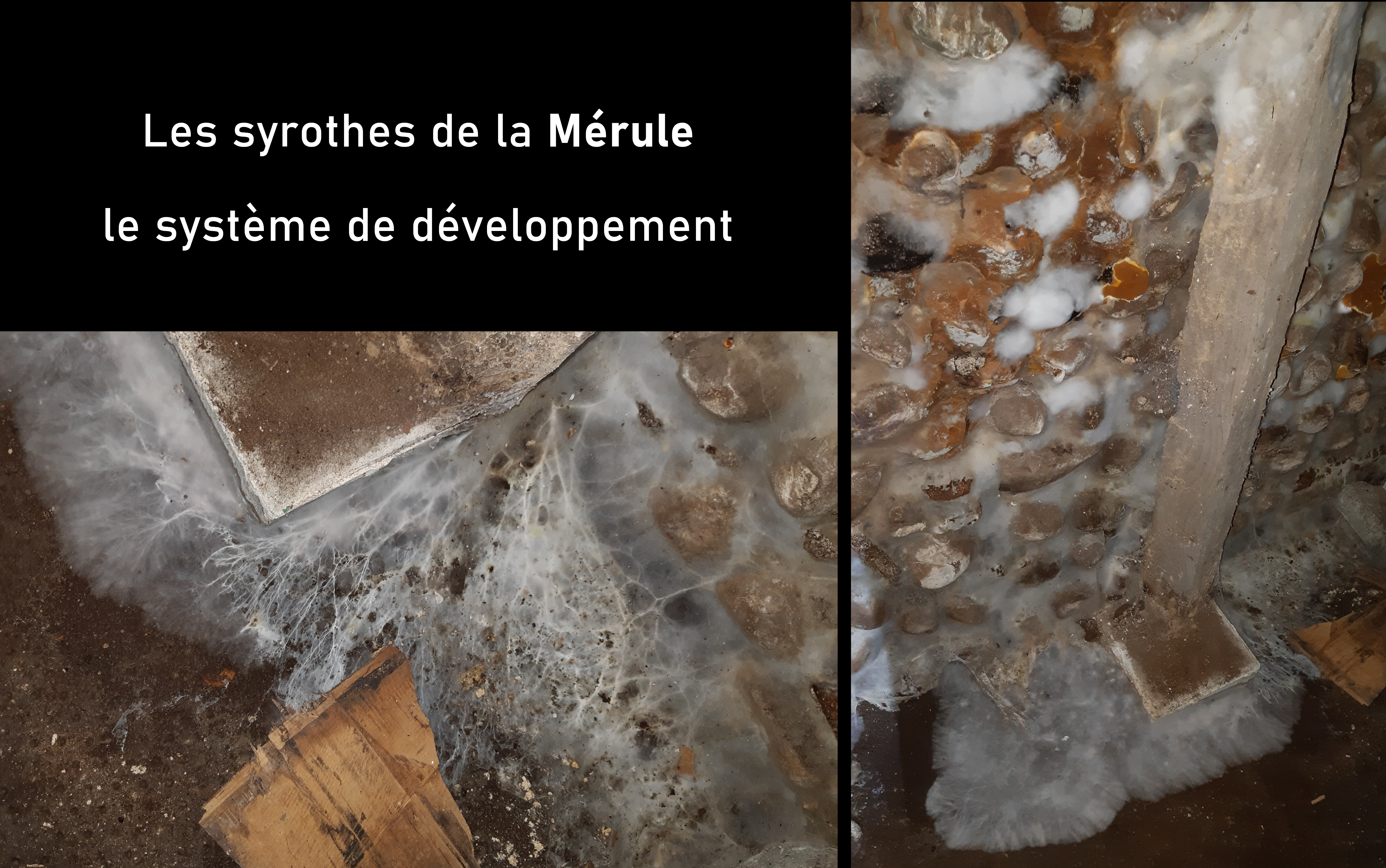 Il traverse les murs de pierre et béton. Pour ce développer la mérule a besoin d'une humidité permanente et d'une cavité (pas de lumière et de ventilation)