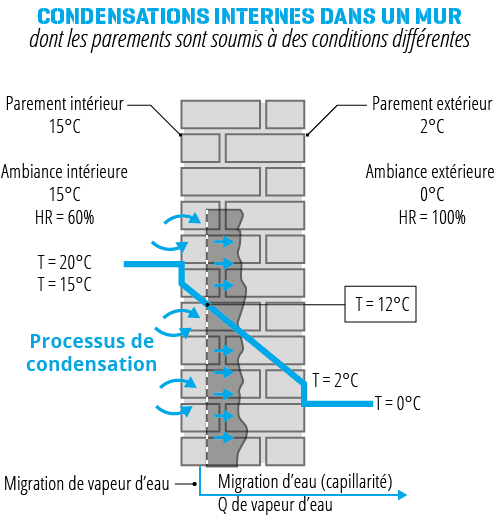 Dans un logement, une athmosphère lourdement chargée en vapeur d'eau qui rencontre une surface plus froide crée la condensation.