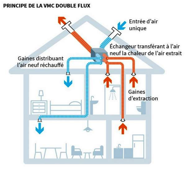 La VMI (insuflée), l'air est souflée en pièce de vie (bleu),